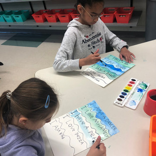 3rd grade students created abstract "All About Me" Self Portraits. Students had to come up with 5 or 6 positive sentences that described who they are. They then painted their art with watercolor paint in "analogous" colors.