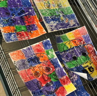 Students learned about the Mexican holiday "Dia de los Muertos" (Day of the Dead) and how it is a beautiful tradition dating back to the Aztec people. 3rd grade learned about symmetry (math connection) and how to make their "calaveras" symmetrical using a tracing technique. They learned how to do a super fun printing process using foil and Mr. Sketch smelly markers (Crayola markers work too, but smelly markers are so much more fun!) and their reactions when they revealed their prints were so great. I explained to students that this is a simple technique they can do at home with paper, markers and aluminum foil.
